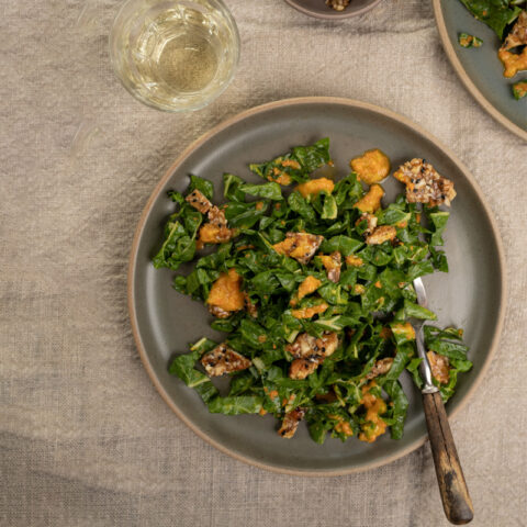 Swiss Chard Salad with Carrot-Miso Dressing and Almond Butter Brittle