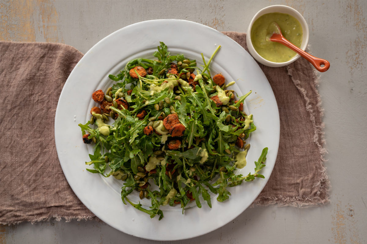 Blackened Carrot and Arugula Salad with Avocado Ranch Dressing