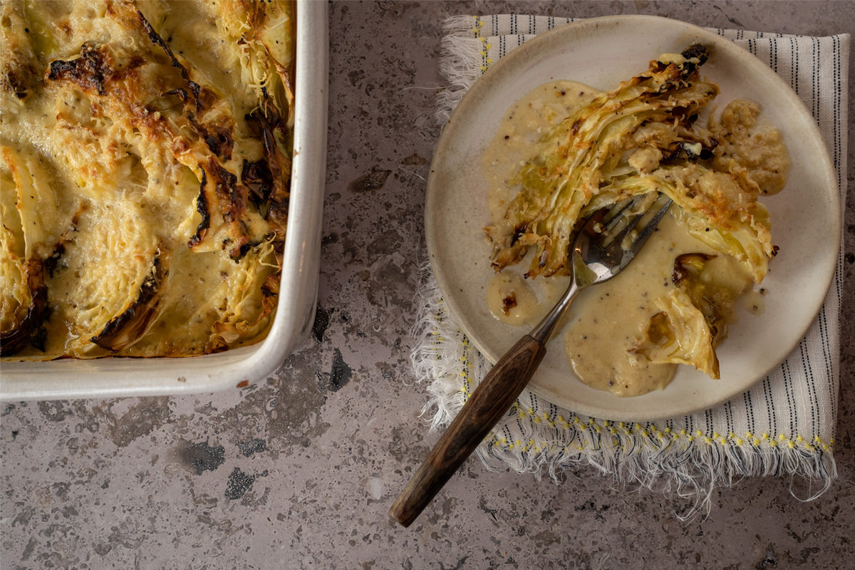 Cabbage, horseradish, and mustard all belong to the Brassica family and go well together, naturally. In our Cabbage Gratin with Horseradish Cream, they come together to make an indulgent, nourishing winter veggie dish — cabbage wedges are baked with a rich cream sauce that has a delightful zing from homemade fermented mustard, horseradish and black pepper, plus a showering of parmesan.