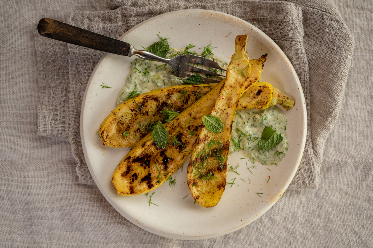 - Spread the green tahini sauce on the bottom of a serving platter. Top with the grilled squash and marinade and garnish with the dill, mint, and parsley. Serve immediately.