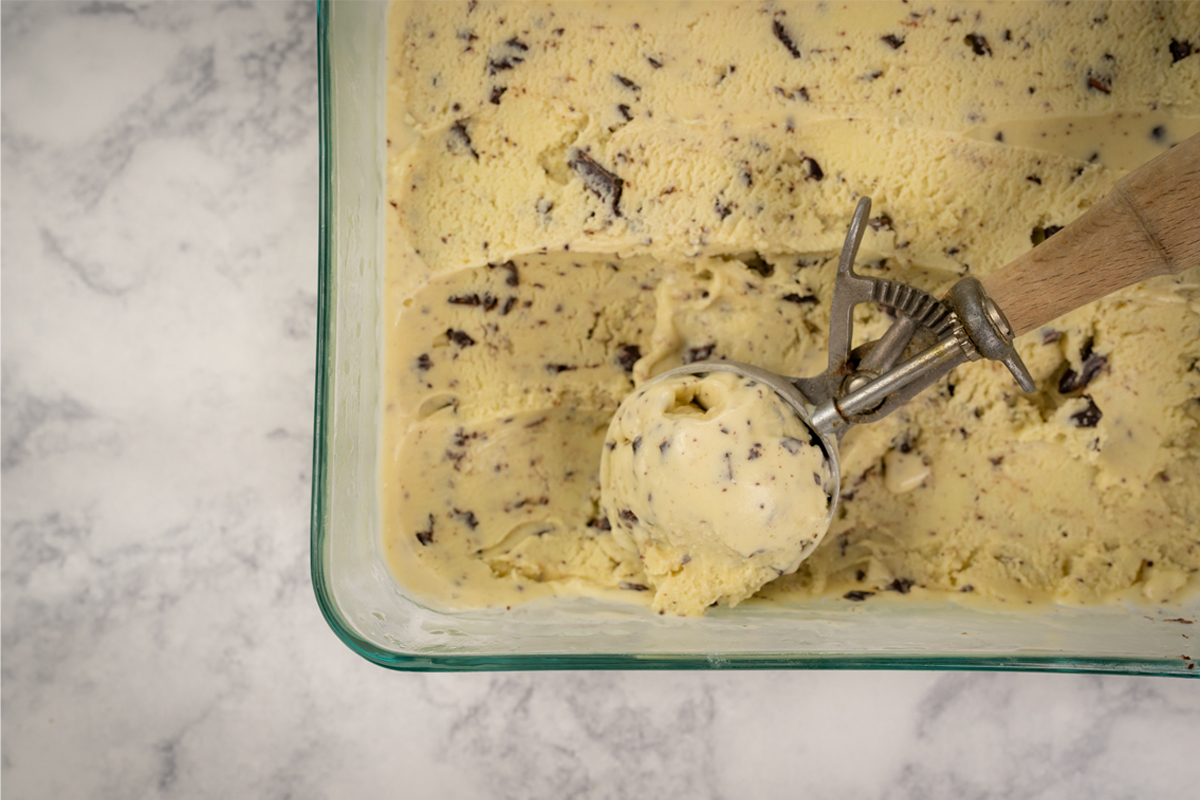 - Set a fine mesh strainer over a 7.5 x 9.5 inch pyrex dish. Pour the cream mixture through the strainer. Discard the mint leaves. Transfer the ice cream mixture to the refrigerator and chill for at least 3 hours.