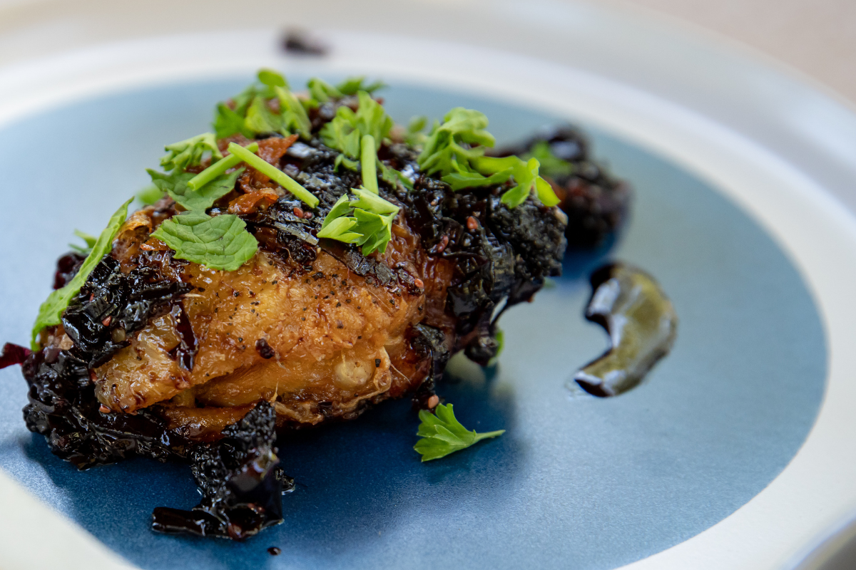 This sticky, sweet chicken is a favorite of ours during the month of May when the mulberry trees are laden with fruit and beautiful leeks are coming out of the garden. Essentially, we make a savory-tangy jam and then use it to coat perfectly crisp roasted chicken thighs. Topped with a sprinkling of fresh herbs, it is simple and delicious served over a bed of steamed rice or creamy mashed potatoes.