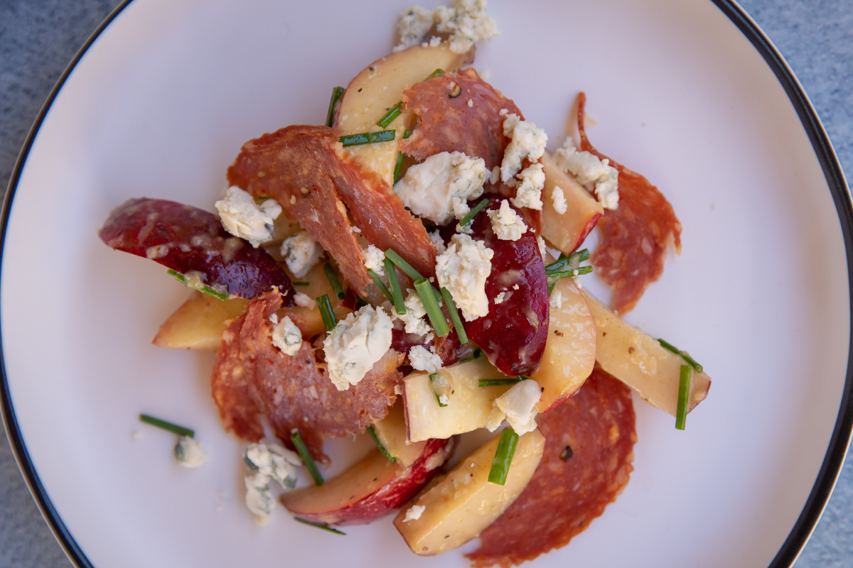 - Lay out half the salami slices on the bottom of a serving platter. Carefully arrange the nectarines over the salami. Tuck the remaining salami slices into the nectarines. Garnish with the crumbled blue cheese, remaining chives and more dressing if desired. Serve immediately.