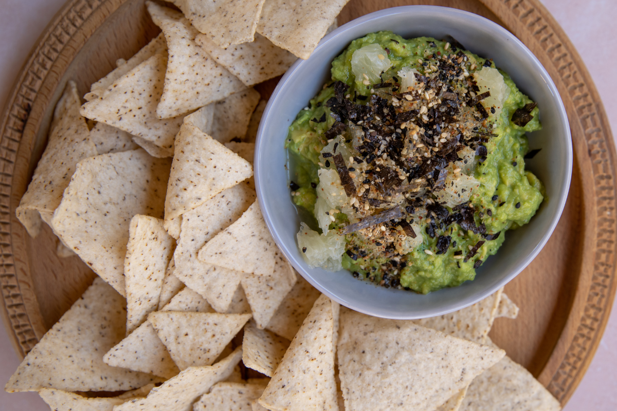 - Make the guacamole: Scoop the avocado flesh into a medium bowl. Add the lemon juice, grapefruit zest, grapefruit juice, garlic, and salt. Using a fork, mash the avocados and mix until well incorporated. Transfer the guacamole to a serving bowl and garnish with chopped grapefruit, green onion, and a generous sprinkling of Furikaki. Serve immediately.