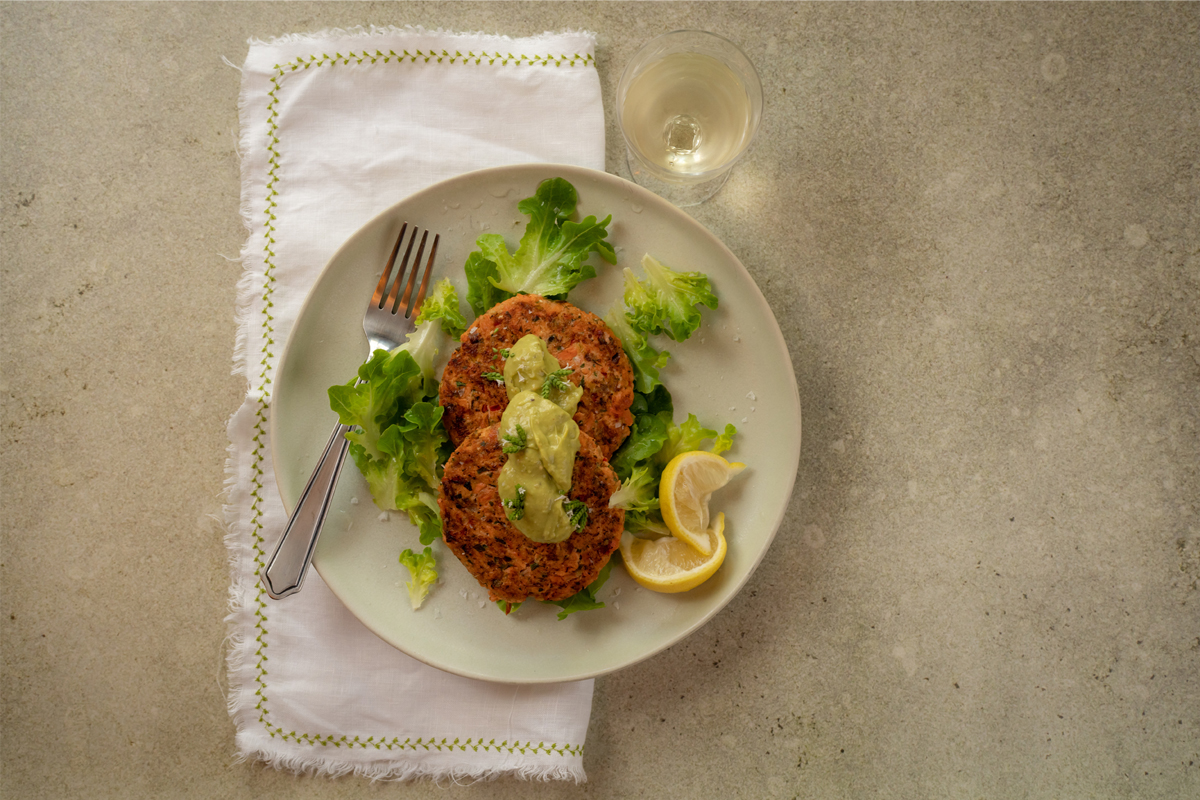 We don’t often cook fish at the farm since we have a steady supply of amazing meats available to us, but every now and then we will serve these salmon cakes to employees in our meal program because they are just so tasty! Be sure to source wild-caught salmon from your local purveyor since they are fished more sustainably than other types of salmon. While remoulade is traditionally made with mayonnaise, this version uses a combination of buttermilk and avocado (we always have avocados on hand!) for a creamy, tangy sauce that pairs nicely with the cakes.