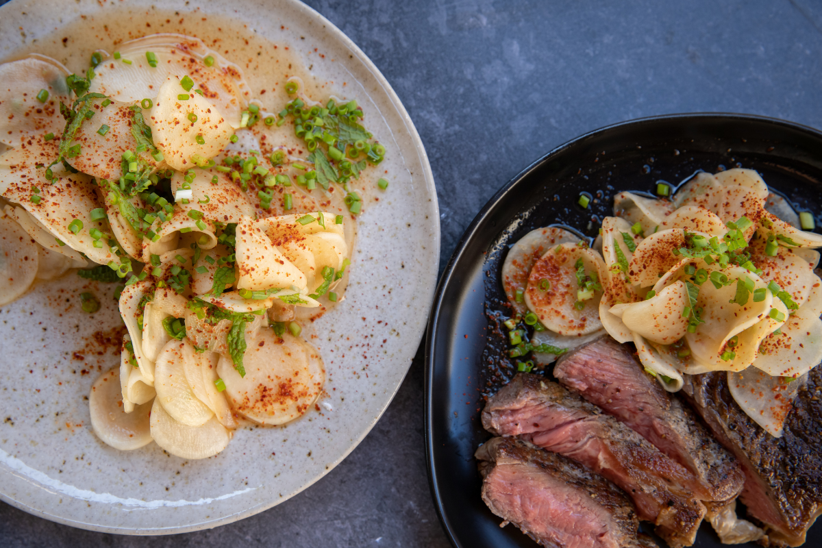 A Tokyo turnip is a smaller, more mild variety that looks more like a white radish. Because they are less spicy and more tender than the type you typically find in grocery stores, we love to serve them raw or pickled. In this recipe, the texture of the turnips becomes reminiscent of pickled ginger as they marinate in the acidic dressing. They provide a powerful punch of flavor and texture that pairs so well with grilled steak or fish. We like using them just after they’ve been tossed with the dressing, though you can make them up to a day in advance–just don’t add the herbs until you are ready to serve.