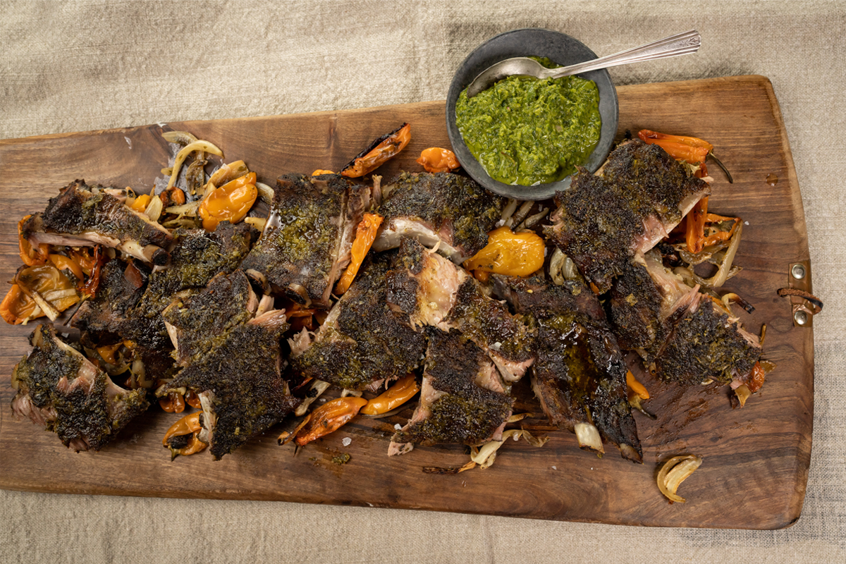 - Remove the ribs from the oven and let cool for 15 minutes. Transfer the racks to a cutting board, bone side up. With a sharp knife, portion the ribs. Spoon the cooked peppers, onions and pork juices from the baking sheet onto the bottom of a serving platter. Place the ribs on top. Serve warm with extra green sauce on the side.